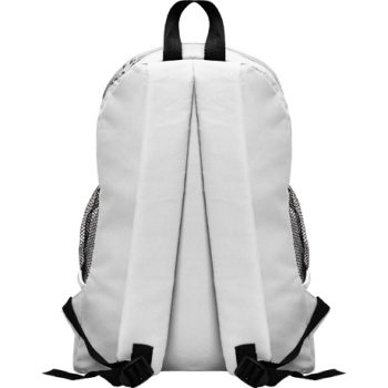 Mochila pequeña con asas ajustables. 1.- Asa superior para colgar. 2.- Bolsillo frontal con cremallera. 3.- Bolsillos laterales en tejido microperforado.