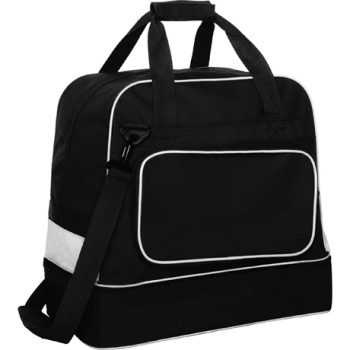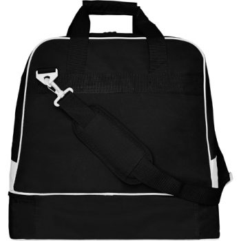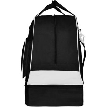 Bolsa deportiva doble asa para colgar y bolsillo frontal con cremallera. Doble fondo reforzado y cremallera para zapatillero. Anti-humedad. Base con tacos. Fácil limpieza.