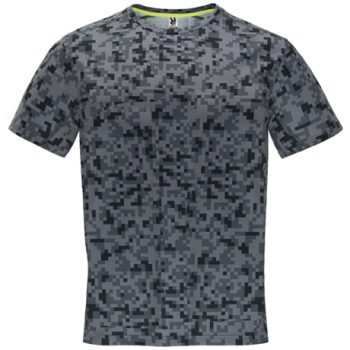 Camiseta técnica estampada de manga corta. Cuello redondo con cubrecosturas de refuerzo a contraste en color amarillo flúor. Paneles laterales en interior de manga y en los hombros con remallado a tono.