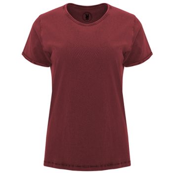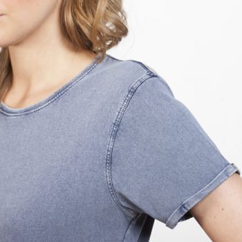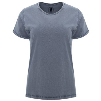 Camiseta de manga corta efecto jeans para mujer. Cuello fino redondo en canalé 1×1 con cubrecosturas de refuerzo de hombro a hombro. Doble costura en sisas. Apertura de manga con dobladillo.