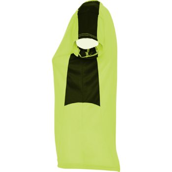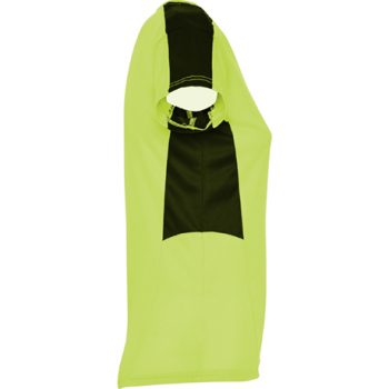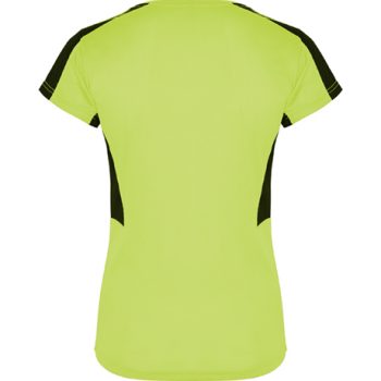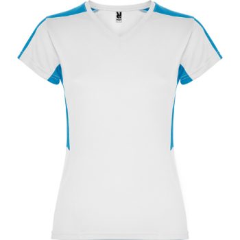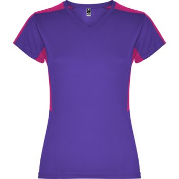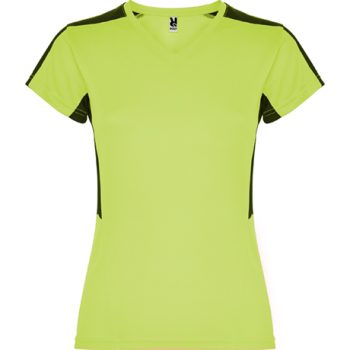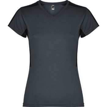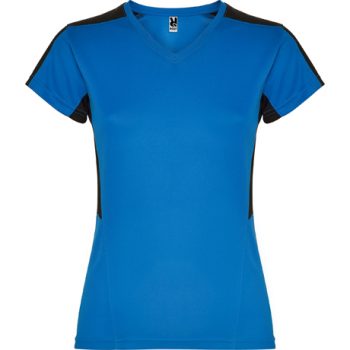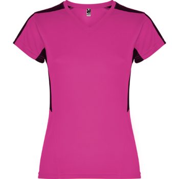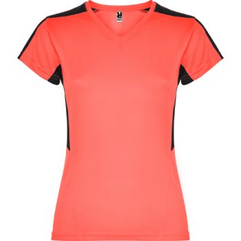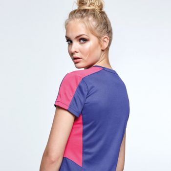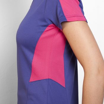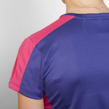 Camiseta técnica de manga corta para mujer. 1.- Cuello pico. 2.- Combinada en laterales y hombros con dos tejidos de poliéster. 3.- Tejido principal bird´s eye y tejido rejilla 3D transpirable en hombros y paneles laterales. 4.- Tejido preparado para la absorción de humedad.