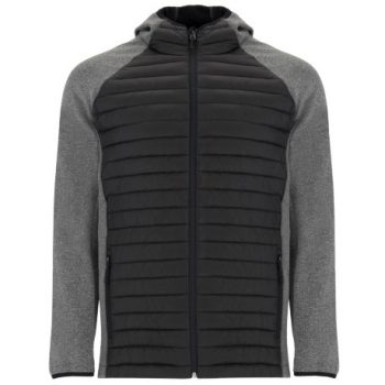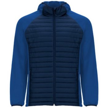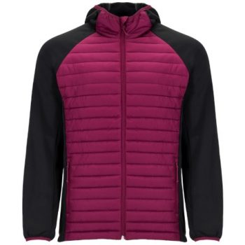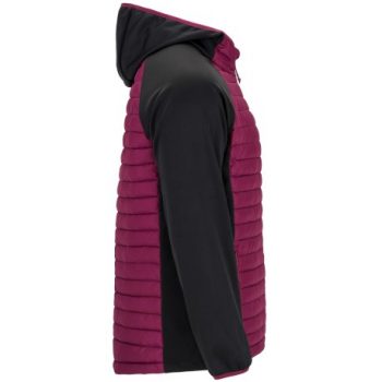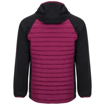 Chaqueta de hombre combinada en dos tejidos: 1. Capucha fija ajustada. 2. Manga estilo ranglán. 3. Tejido softshell en mangas, paneles laterales y capucha. 4. Tejido acolchado tacto pluma en frontal y espalda. 5. Cremallera invertida a tono con protector de barbilla y tirador. 6. Dos bolsillos frontales con cremalleras. 7. Ribete elástico a tono en cuello, puños y bajo.