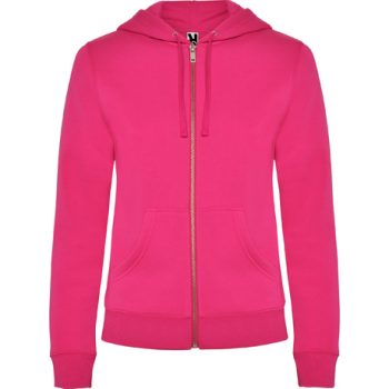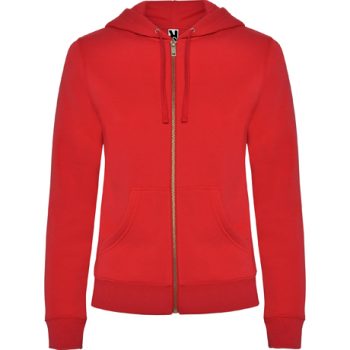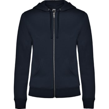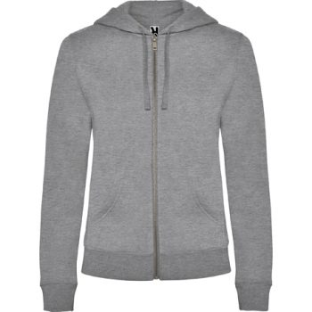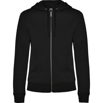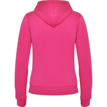 Sudadera de mujer con capucha forrada a tono. 1.- Cremallera metálica frontal. 2.- Bolsillo estilo canguro. 3.- Cubre costuras reforzado en el cuello interior. 4.- Punto canalé 2×2 en puños y cintura. 5.- Corte entallado.
