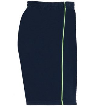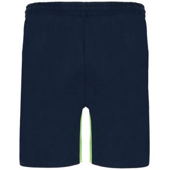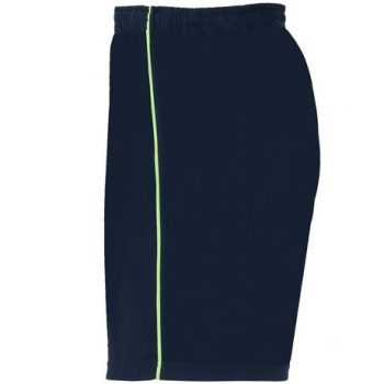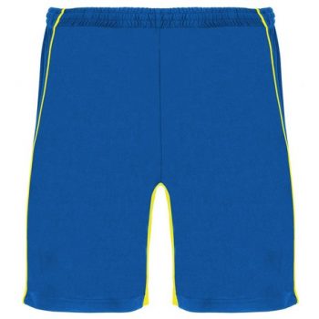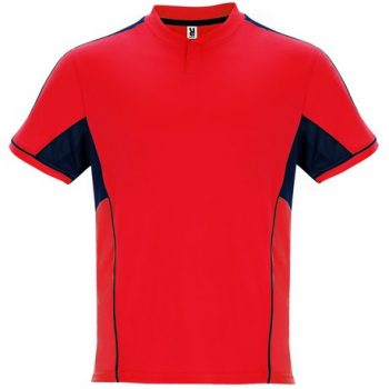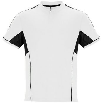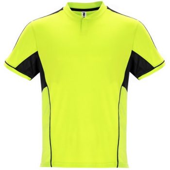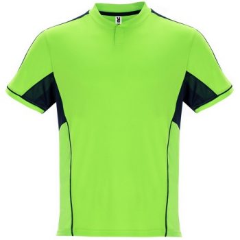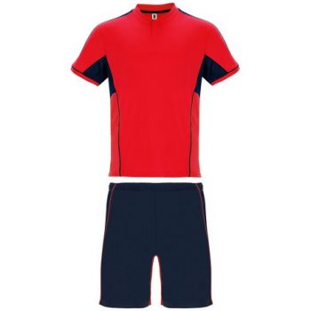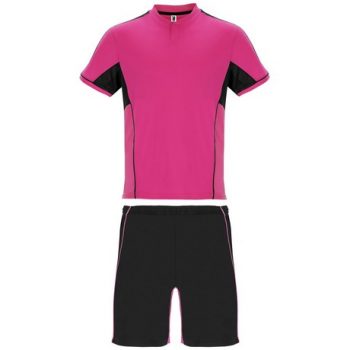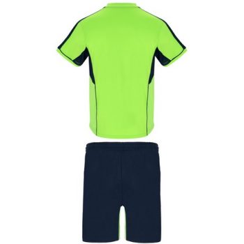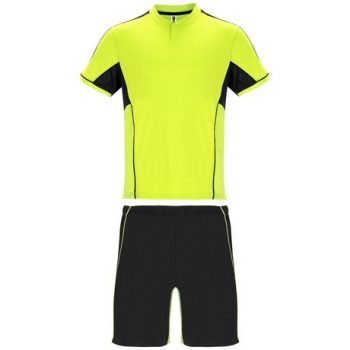 Conjunto deportivo unisex con combinación de tres tejidos: 1. Camiseta con cuello mao y apertura mediante broche de presión. 2. Interior de la manga en tejido tranpirable. 3. Paneles laterales y banda superior de manga en tejido control dry. 4. Pantalón corto con cinturilla ajustable y cordones. 5. Parte interior de la pierna y vivos a contraste en tejido control dry.