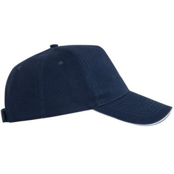 Gorra de 5 paneles con sándwich a contraste. 6 líneas de pespunte en visera. Cuatro agujeros de ventilación. Cinta interior antisudoral. Cierre de velcro.