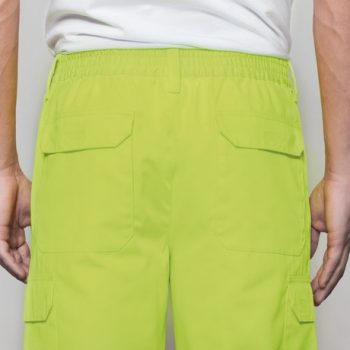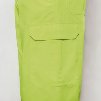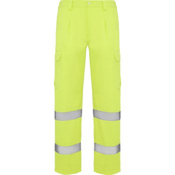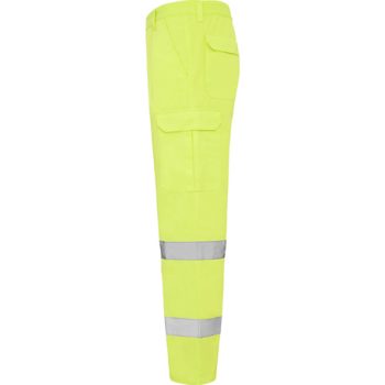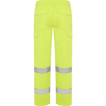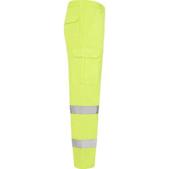 Pantalón largo de alta visibilidad amarillo flúor. 1.- Cinturilla ajustable elástica en la parte trasera. 2.- Dos bolsillos frontales. 3.- Bolsillo funcional trasero con tapeta y cierre de velcro. 4.- Dos bolsillos laterales con fuelle y tapeta con cierre de velcro. 5.- Dos cintas reflectantes horizontales.