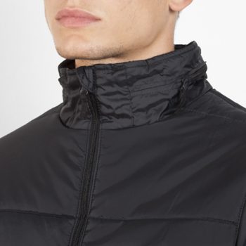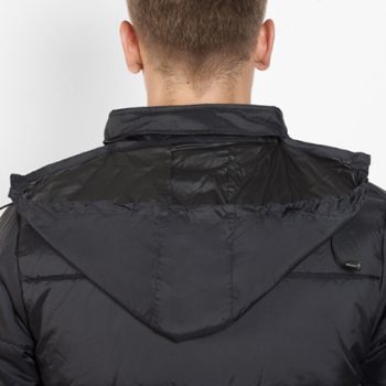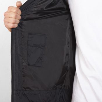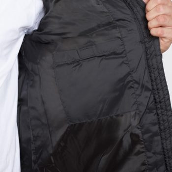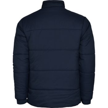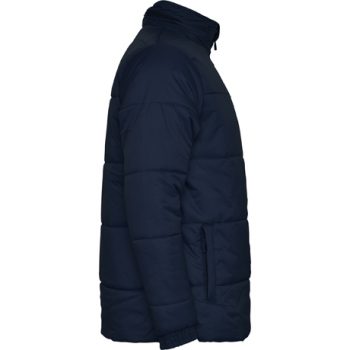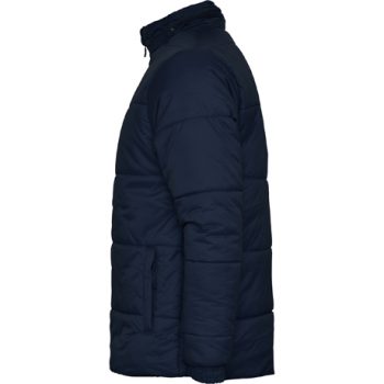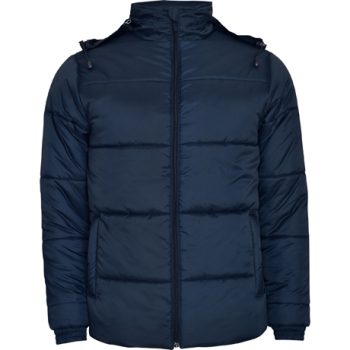 Abrigo acolchado con relleno: 1.- Capucha extraíble en cuello con cremallera inyectada. 2.- Cremallera frontal completa inyectada con tirador y protector de barbilla. 3.- Puños elásticos. 4.- Dos bolsillos exteriores con solapa. 5.- Bolsillo interior para cartera con velcro. 6.- Bolsillo interior con tapeta para móvil.