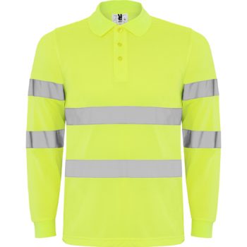 Desarrolla tu profesión de manera segura con el polo de alta visibilidad de Roly. Con dos bandas reflectantes horizontales en torso y mangas, y tejido anti enganches para garantizar su durabilidad.