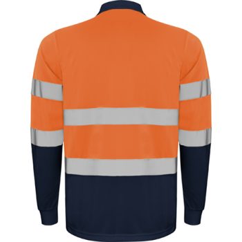 Polo técnico manga larga de alta visibilidad. Con tapeta a 3 botones. Cuello y puños en punto canalé 1×1. Dos bandas reflectantes horizontales en torso y mangas. Tejido anti enganches.