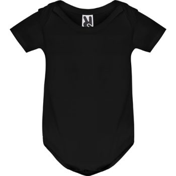 Body de bebé con manga corta de punto liso. Cuello redondo y bajo ribeteado en canalé 1×1. Cierre con botones a presión en la entrepierna. Hombro de apertura cruzada.